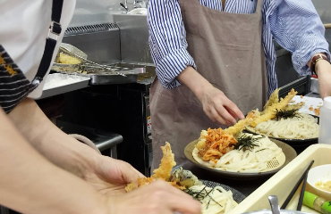 うどんの本質「麺、だし、天ぷら、盛付け」を学び、実際の店舗と同じような「仕込みからオペレーション」の販売を体感し、仕組みをマスターしてください。 習得に制限はないので、基礎を学びたい方、もっと極めたい方も大歓迎です。